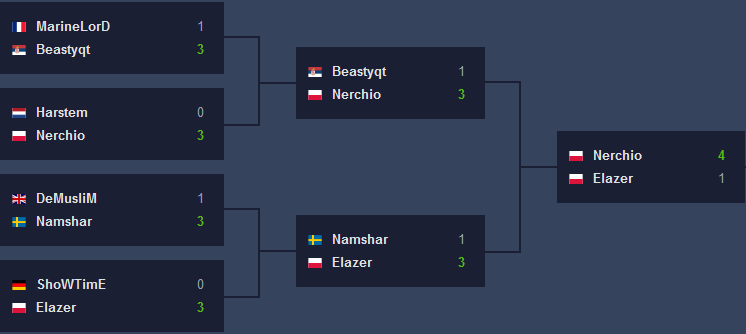 Dwie świetne wygrane pozwoliły stanowić Polakom połowę pośród najlepiej czwórki turnieju, jednak nie był to koniec ich fenomenalnych występów. Spotkania półfinałowe dla naszych rodaków były jedynie formalnością i po rozgromieniu swoich rywali musieli stanąć przeciwko sobie, by wykazać, który z nich jest lepszy. Niestety, każdy, kto oczekiwał rozegrania podczas finału wszystkich siedmiu map, musiał szybko się rozczarować, gdyż Nerchio pozwolił Elazerowi zdobyć zaledwie jeden punkt.