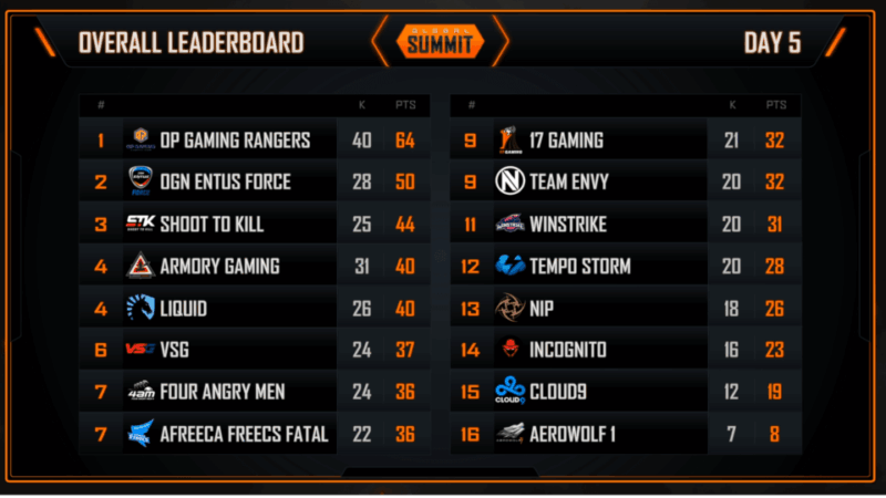 Po 6 sobotnich spotkaniach, przedstawiciele koreańskiej sceny PUBG wiodą prym w tabeli. OP Gaming Rangers po świetnych grach zajęli pierwsze miejsce uzyskując 64 punkty. Z dorobkiem 50 punktów na drugim miejscu uplasowali się zawodnicy OGN Entus Force. Trzecie miejsce po pierwszym dniu rozgrywek należy do amerykańskiej organizacji Shoot To Kill.
