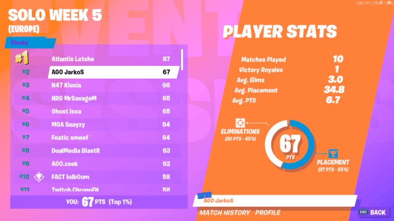 Podopieczny AGO Esports – Jarek „JarkoS” Kaleta dostał się do wielkich finałów Fortnite World Cup i we wczorajszej edycji kwalifikacji, zajął drugie miejsce! Pierwsze miejsce padło łupem Letshe, który zdobył niesamowitą ilość 87 punktów! na trzecim miejscu znalazł się Klusia z dorobkiem 66 punktów, a sam JarkoS zgarnął 67 punktów.