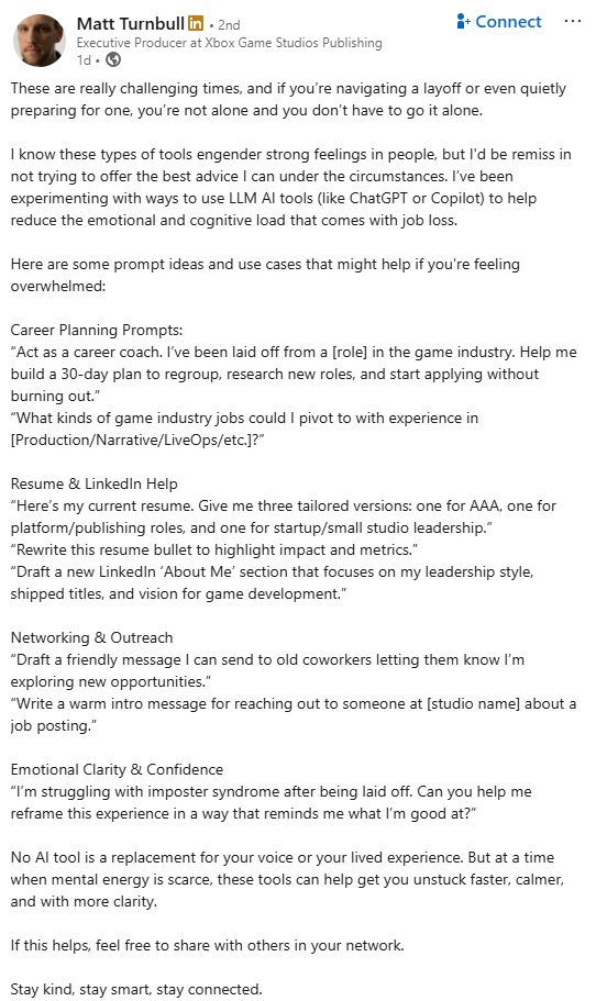 W tym całym zamieszaniu, jakby oliwy do ognia dolał Matt Turnbull, executive producer z Xboxa. W poście na LinkedInie, który szybko stał się wiralem, doradził zwolnionym pracownikom, by… używali AI do planowania swojej dalszej kariery. Reakcja była natychmiastowa i miażdżąca. Wiele osób uznało to za skrajnie nie na miejscu, wręcz obraźliwe.