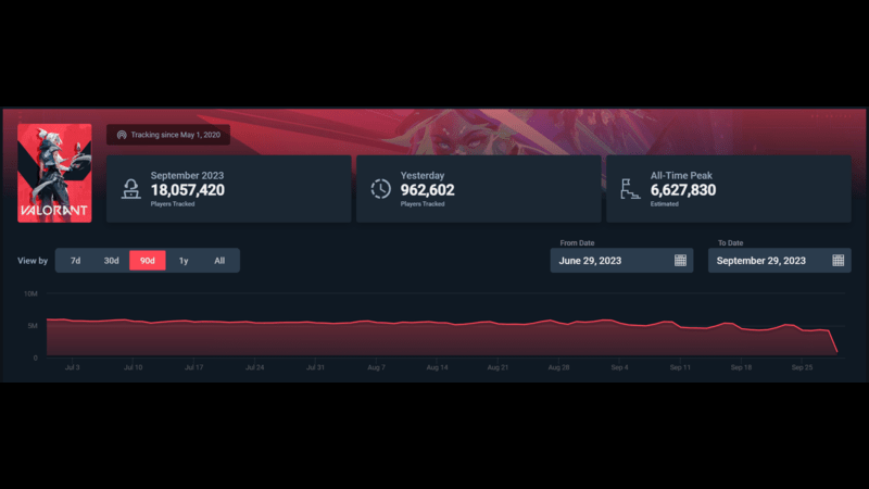 Przyjrzyjmy się liczbie graczy Valorant. Tracker.gg donosi o imponującej miesięcznej liczbie graczy wynoszącej około 5 milionów, co wskazuje na dobrą kondycję gry. Warto jednak zauważyć, że w maju 2022 r. Valorant miał prawie 2 miliony graczy miesięcznie, co oznacza znaczny spadek o 25% w ciągu zaledwie jednego roku – co zbiega się z odrodzeniem CS:GO.